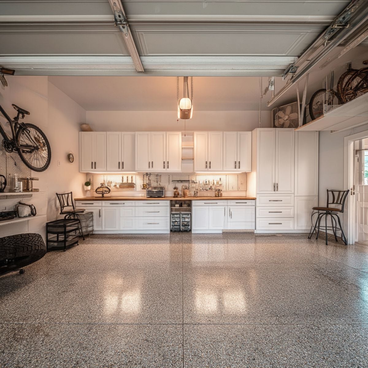 Minor upgrades can change first impressions, especially the floor. Stained concrete with cracks and oil spots makes the entire garage feel neglected. A clean, durable surface makes the space feel newer and more valuable.