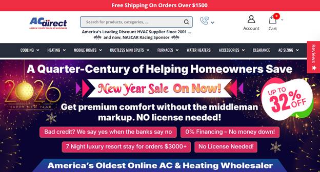 AC Direct has sold HVAC systems since 2001. Its products include ductless mini-splits and heat pumps, as well as other heating and cooling and mobile home options. It also offers free shipping on purchases exceeding a certain amount.